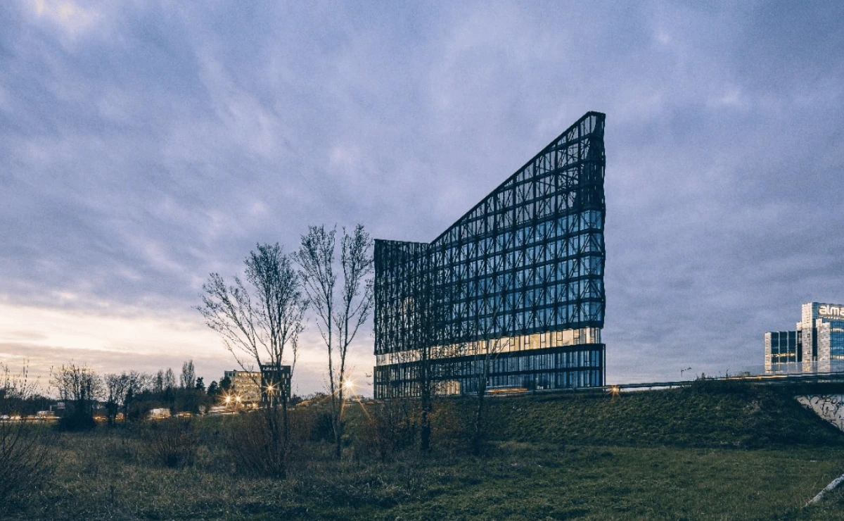 El edificio de oficinas se alza como un nuevo y llamativo referente urbano. Su forma trapezoidal, combinada con fachadas de vidrio transparente y aluminio oscuro, evoca la imagen de un diamante. El volumen se divide claramente en dos partes: las dos primeras plantas, que parecen flotar sobre una base completamente acristalada orientada hacia una plaza ajardinada, y el cuerpo superior, del cuarto al octavo piso, que da la impresión de desafiar la gravedad por encima de la tercera planta, que actúa como una línea de fractura acristalada.