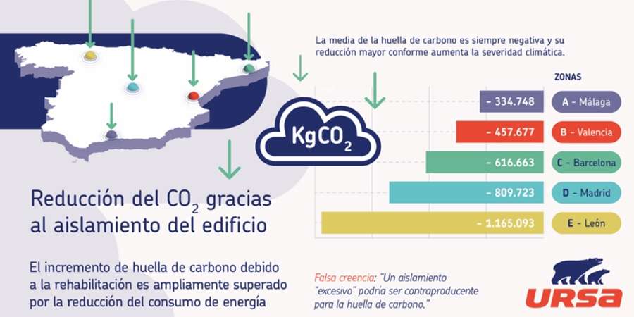El informe también demuestra que la reducción de la huella de carbono es mayor en las zonas climáticas con condiciones más extremas, aunque en climas más benignos (como la zona A), la rehabilitación sigue siendo ambientalmente recomendable. Del mismo modo, se aportan cifras para comprobar que las mayores reducciones se logran con aislamientos de mayor espesor.