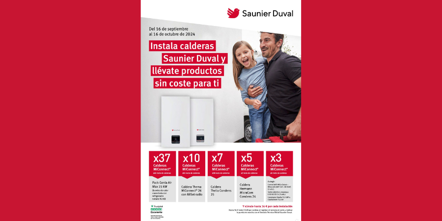 Del 16 de septiembre al 16 de octubre, los profesionales que adquieran calderas Saunier Duval podrán obtener productos sin coste registrando los números de serie en Instal CLUB. Además, al realizar la puesta en marcha con el Servicio Técnico Oficial, podrán ganar hasta 36 € adicionales.