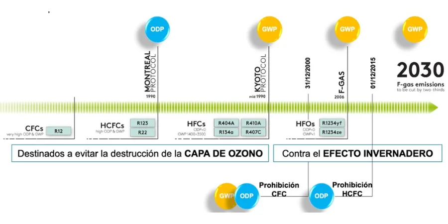 Ha sido necesario limitar el uso de refrigerantes, en la medida que se han conocido sus consecuencias nocivas contra nuestro medio ambiente. Este fue el caso de los CFCs y los HCFCs. Ya en el protocolo de Montreal, en el 1990 se establecieron las bases para la progresiva eliminación de estas familias de refrigerantes, dado su potencial de destrucción de la capa de ozono, conocido como ODP (ozone depletion potencial). Esto llevó a la desaparición de refrigerantes tan habitualmente usados como el R-22.