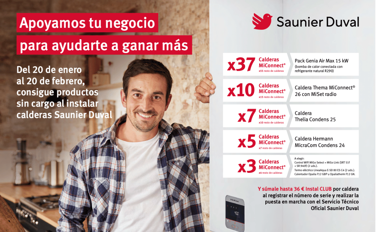 Hasta el 20 de febrero, los profesionales que instalen calderas Saunier Duval podrán obtener productos sin cargo al registrarlas en Instal CLUB. Además, recibirán hasta 36 € adicionales al activar la puesta en marcha con el Servicio Técnico Oficial.