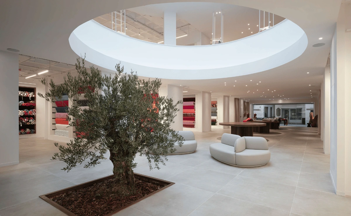 El sistema de iluminación de Simon aporta versatilidad, discreción y vanguardia técnica. El modelo Slim System, con CRI90, ofrece una luz fiel al color y natural, garantizando una excelente reproducción cromática en los tejidos. Su presencia sutil y enrasada se integra en el espacio sin alterar su pureza formal. La instalación se completa con los sistemas Hole 25 y Hole 50, soluciones empotradas que permiten un control preciso de la luz, así como una serie de proyectores diseñados para generar el efecto distintivo de la cúpula encendida durante la noche, transformando la percepción del espacio y su ambiente nocturno.